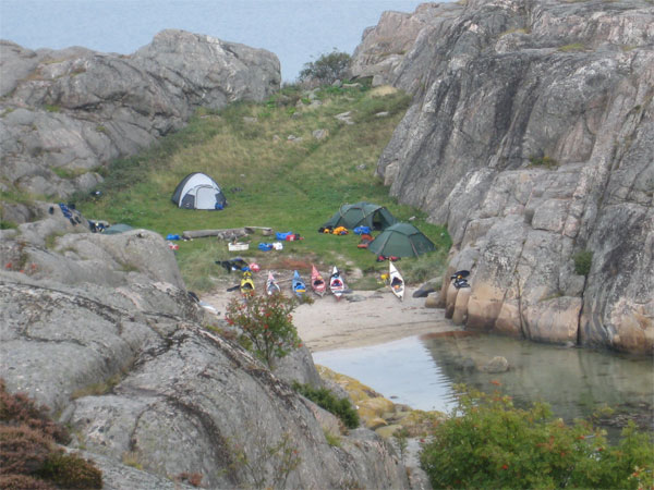 Så här fin är övernattningsplatsen på Käften. På klipporna ovanför gräsplätten där vi satte tälten finns det en alldeles plan och skyddad platå . Vid ostlig vind är den perfekt för kaffe och avec. I-landsproblemen löser sig nästan av sig själva och utsikten är vidunderlig! 🙂