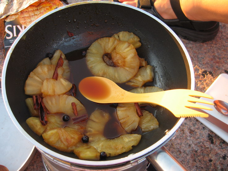 En härlig doft när ananasen sjuder i sin egen saft spetsad med gin.