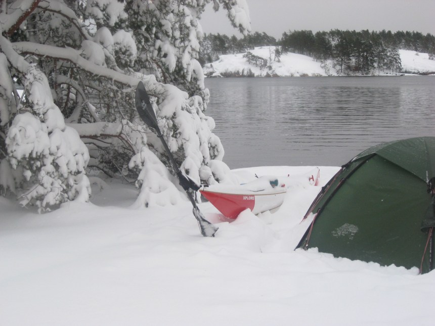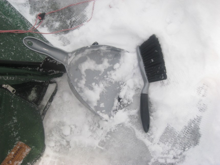 På årets adventspaddling snöade det rätt hyfsat. Vid packningen av kajakerna hittade vi en sopborste med skyffel i bilens bagage, antagligen rester från ett patetiskt men ack så tappert försök att städa bilen. Helene packade ned skyffel och borste i sin kajak. Snacka om genidrag! Skyffeln är perfekt att skrapa undan snö med (om man är rädd om sin paddel). Borsten behövs när man borstar rent yttertält och absider från insläpad eller inblåst snö. Så här smarta kajakprylar hittar man på ICA Maxi! 🙂