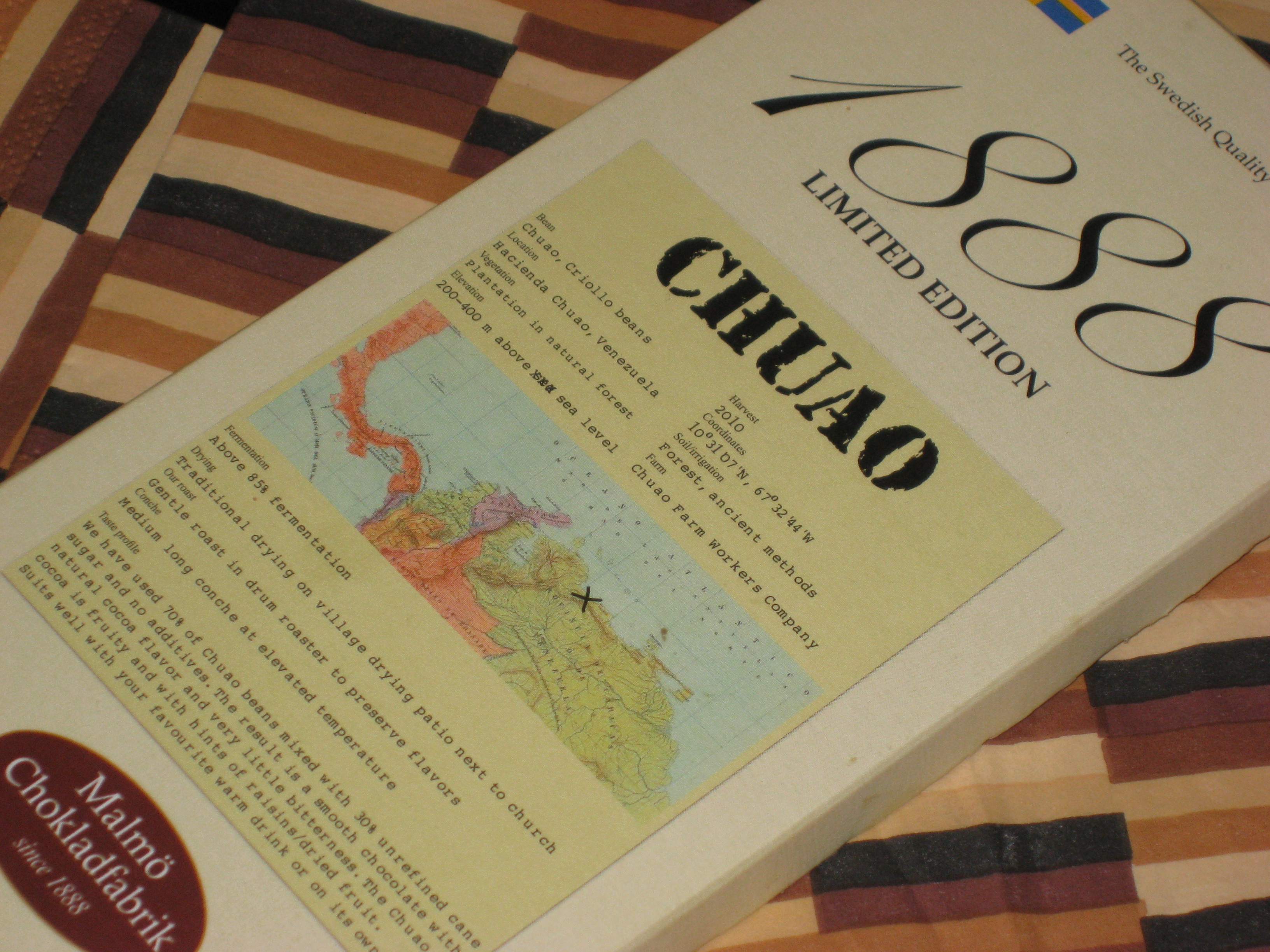 Till esset i sortimentet, ”Chuao”, har man hämtat en laddning Criollo-bönor från mytomspunna Chuao i Venezuela. Med 70% kakaomassa av den fantastiska Criollo-bönan och 30% oraffinerat råsocker och doftar den supergott. Smak av frukt, bär med lite nyanser av russin. Aning torr, syrlig smak, dock lite väl grynig och sträv i konsistensen. Jysst eftersmak.