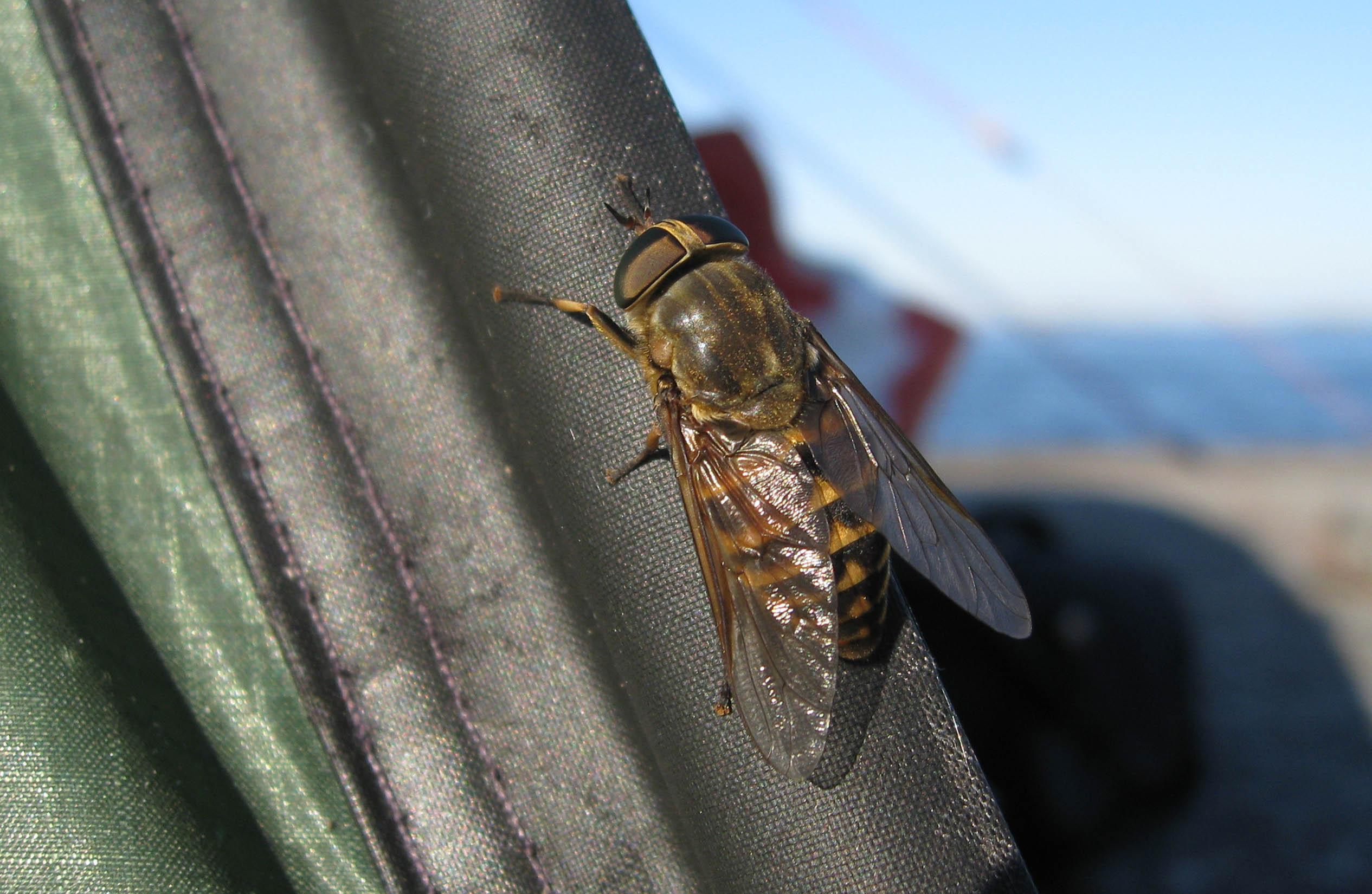 Besökare nr jääättemånga. När vi vaknade på morgonen hade Sveriges småflugor konferens på tältets läsida. Snälla men ganska läbbiga.