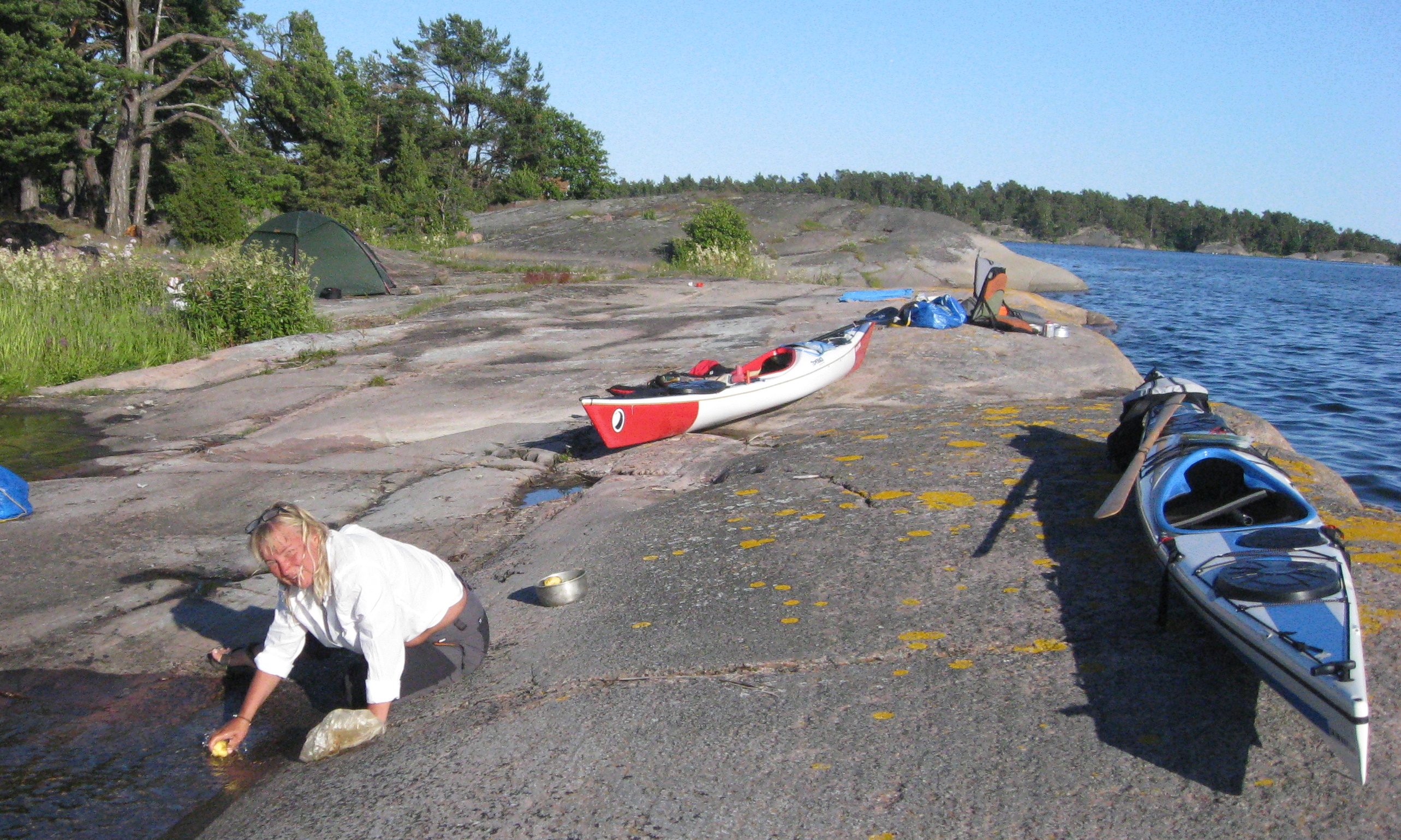 Helene skrubbar potatisen mot Lilla Tallskärs klippor.