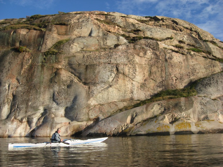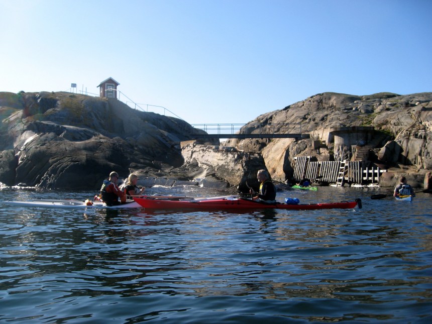 Incheckning på Stor-Svinningen torsdag kväll. Efter en kylig natt – det lär varit is i Fjällbacka by – strålade solen fredag morgon. Med en vind på 2-3 m/s var det klart Väderö-läge. Efter lugn paddling över, tumlarspan, topptur, lite geocaching och fika/öl på värdshuset kände vi oss väldigt nöjda. Vi var några paddelsugna som fortsatte västerut och kikade på Väderöbod där det finns en fyr med en intressant historia. Läs här. Idag ägs den av Föreningen Väderöbod som köpte den av Sjöfartsverket för 1 kr! Inte lätt att gå i land så vi nöjde oss med ett varv runt. Sedan en skön fin tur över stilla vatten i kvällssol bort till St Måkholmen. En klart häftig dag! 🙂