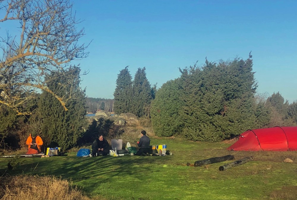 Det hade brunnit på toppen av ön. Svårt att säga hur längesen, men det luktade fortfarande otäckt av brandrök. Utsikt från Porsholmen.Gott om både gullvivor…… och ängsnycklar på Porsholmen.Nya halvtältet ger perfekt lä. Attans mycket enklare än tarp när man är två!Hemåt.That’s all folks! 🙂