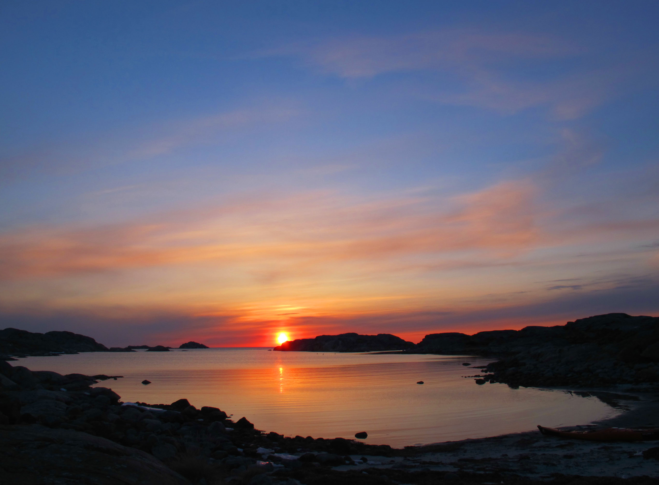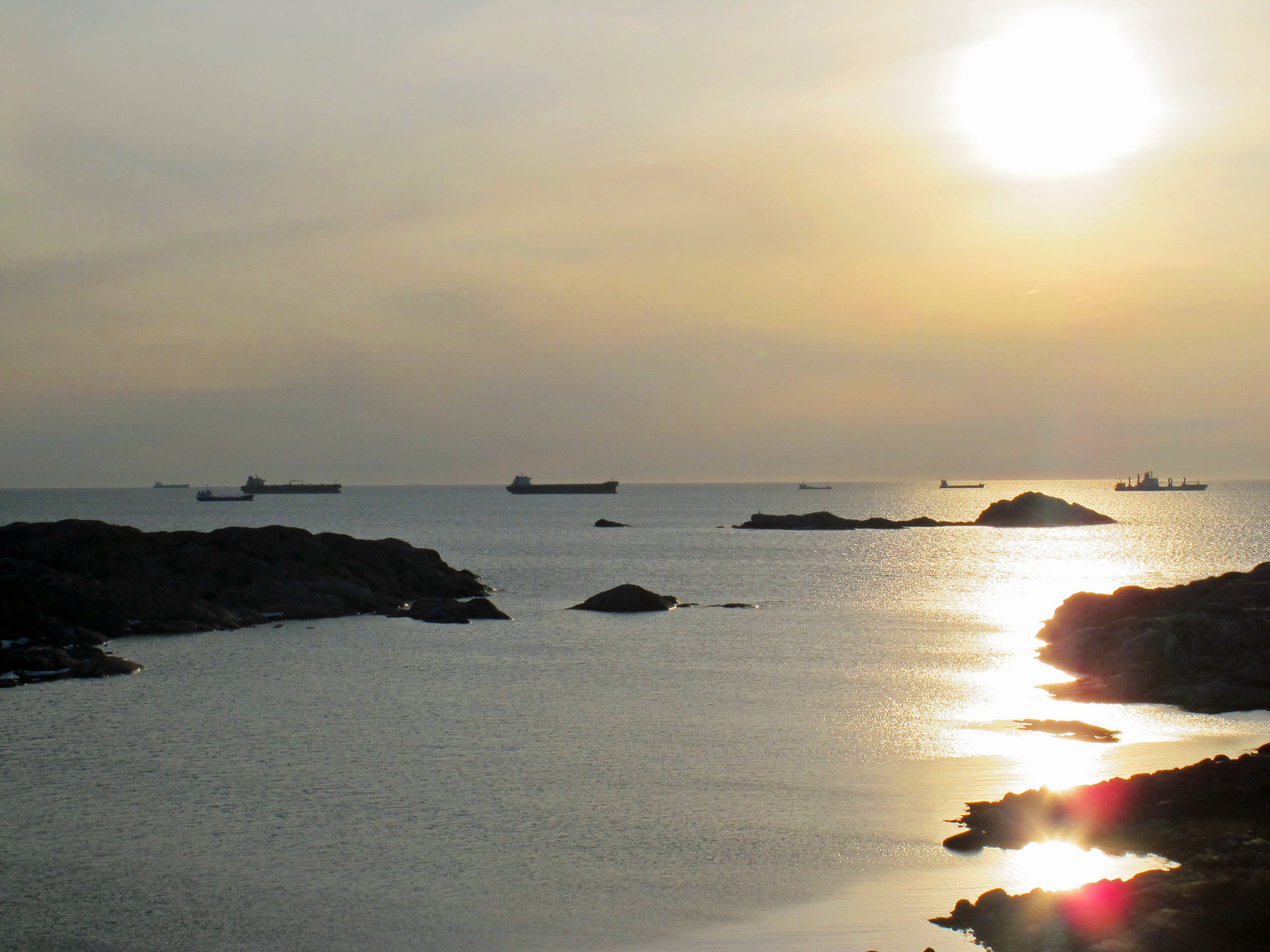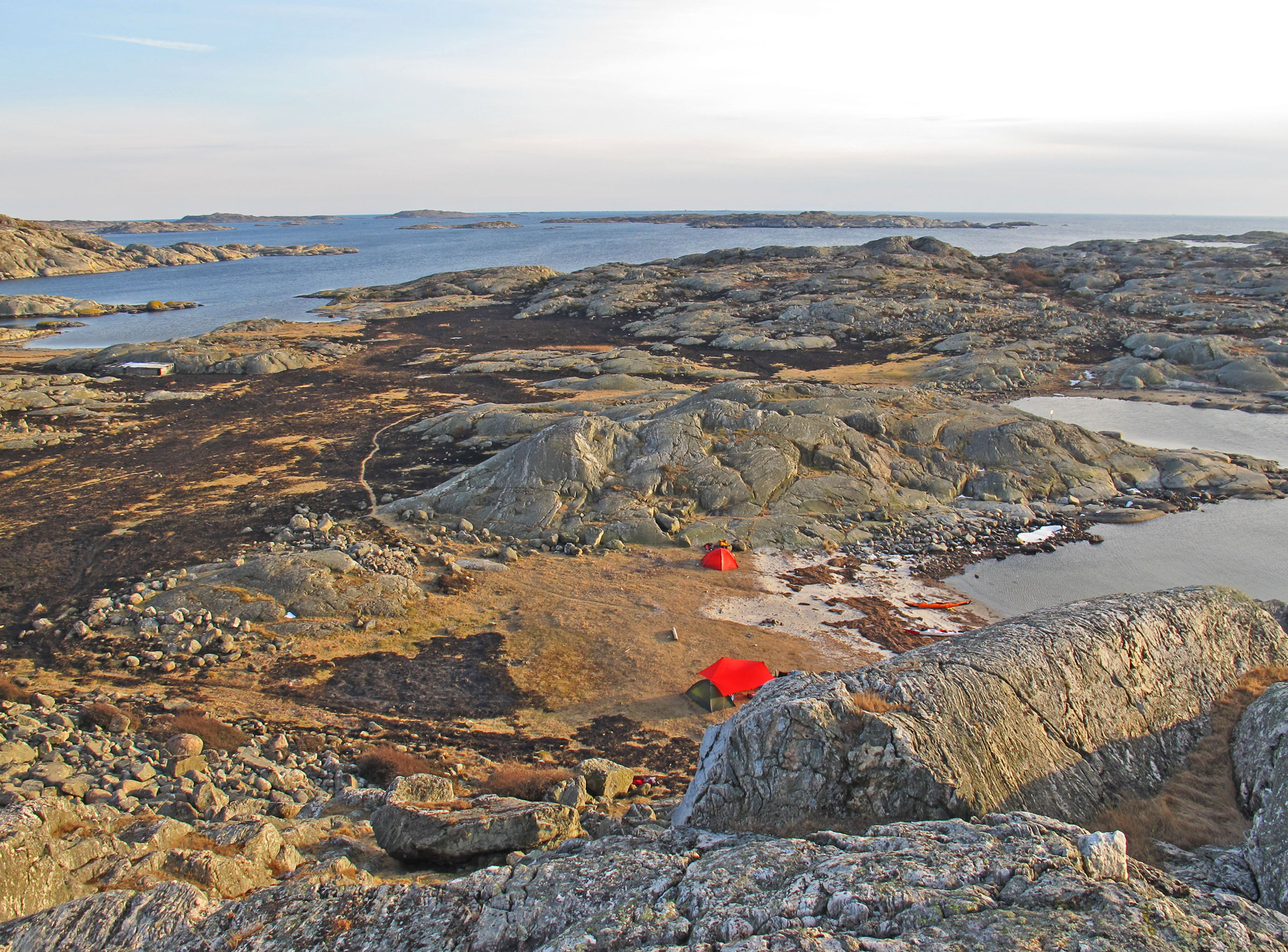 Trots spåren av militärerna samlade dock Galterö poäng, sakta men säkert. Bra tältplats, lite lä från klippan bakom oss. Lördag morgon startade med en fantastisk soluppgång. Perfekt strand för morgondoppet och god frukost med span på alla stora fartyg som passerade. Lotsbåten var flitig, massor av action i farleden hela tiden!